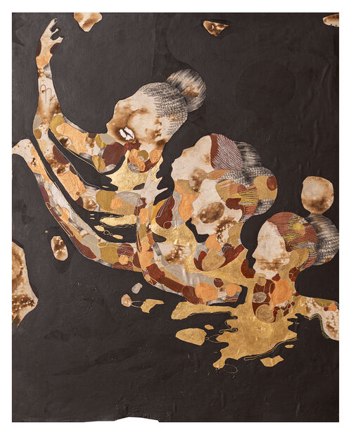 Combining social practice with painting and drawing, Modupeola Fadugba’s arresting work wades into the complex cultural history of the swimming pool, plumbing its symbolism through the lens of different generations and geographies. The Togo-born artist has collaborated with the Harlem Honeys and Bears (a synchronized swim team for older adults), as well as younger swimmers in Nigeria, to create elegant renderings of bodies in water using acrylic, graphite, gold leaf, and burning techniques. The individual identities of her swimmers are often obscured, underscoring ideas of collectivity and cooperation.