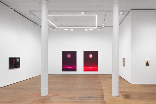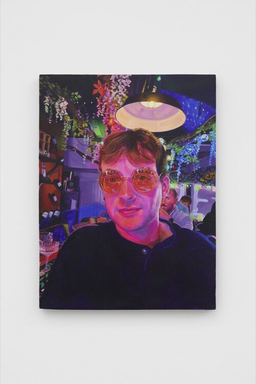 Elsewhere, works like Cece Phillips’s tbt (2023) or Adriel Visoto’s Augusta (2022), both featured in Cob’s “Night, Light.” exhibition, use darkness lit by streetlights or fluorescent bulbs to enhance this feeling in their city scene subject matter, while Alice Miller’s Knowing (2023) explores the unique light provided by new technology—an iPhone flash in the dark. In this work, the artist paints a digitally induced portrait by hand, showing the subject at a bar turning shades of neon pink, reflections dancing in their eyeglasses.