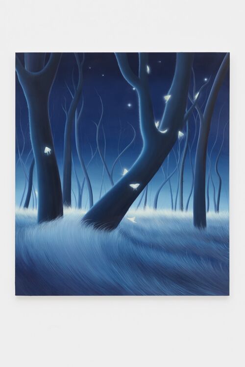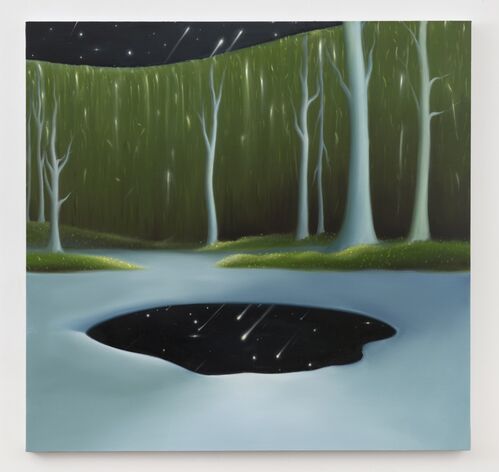 On September 7th, New York gallery Albertz Benda opened its fall season with a solo show of new works by Korean-born, New York–based artist Sarah Lee, whose sublime yet foreboding paintings of moonlit nature draw on the slick oil techniques of Old Masters with brushstrokes that appear, from afar, almost too perfect to be handmade. Lee said she doesn’t track celestial bodies, but she does browse NASA’s website to view the “unreal” telescopic images of galaxies. Her work has changed since the pandemic: “When every day in New York felt almost like perpetual night, I began using darker palettes more frequently,” said the artist, who paints only at night in her East Village studio where photos of the Northern Lights, French illustrations, and a reproduction of John Everett Millais’s Ophelia (1851–52) hang on the wall.
