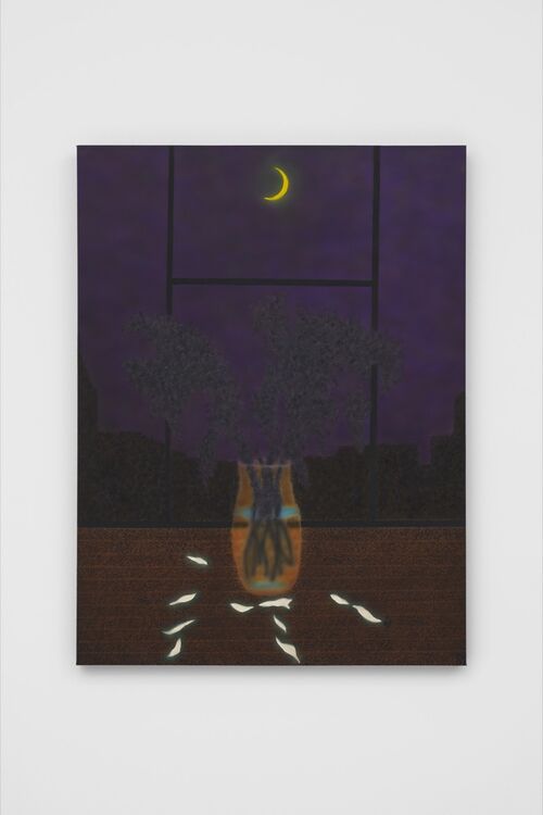 In the urban scenes painted by Brooklyn-based artist Sung Hwa Kim, insects, figures, and plants glow often more brightly than the moon overhead. A frequent nighttime bicyclist, he also finds comfort in the cover of darkness where “the moon, the stars, and the streetlights became my guides, beacons of hope, compassion, and goodwill toward humanity,” Kim explained. Fragments of memories of things he sees on rides are the origins of artworks he makes at night, when he finds “a moment of pause to think and feel clearer,” he said of his studio process. Some of his emotion-driven images toe the line of still life, like in the poetically titled 2022 work When The Evening Song Begins, Everything Turns Into Nothing. From Nothing, You Find Everything (which was included in The Hole show), in which a vase in front of a window appears to become a vessel for the moon and a meadow.