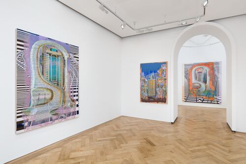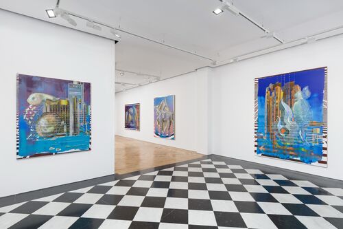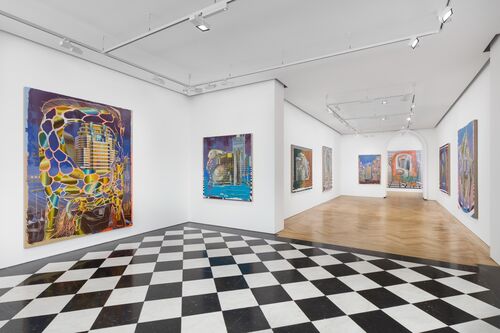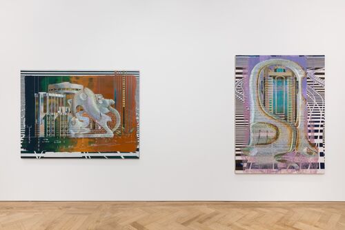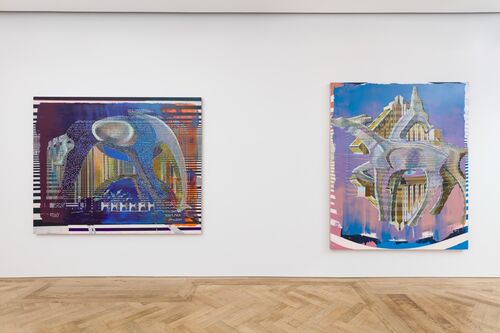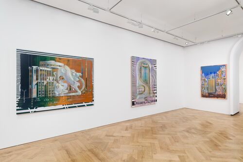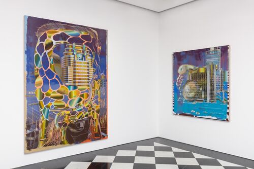 From a quick glance through the large windows of Pilar Corrias Gallery’s Savile Row space, Cui Jie’s works could be mistaken for absurd AI images. Now that users can type nonsense like “a giraffe-shaped skyscraper” into AI-powered image generators, when a (real) artist conjures up such unique amalgamations, they have a different impact from just a few years ago. Jie has painted just this, in acrylic on canvas, with Ceramic Giraffe and State Grid Corporation of China, Beijing (2023): two giraffes positioned as if kissing, framing the somewhat mundane HQ of a state-owned energy company.