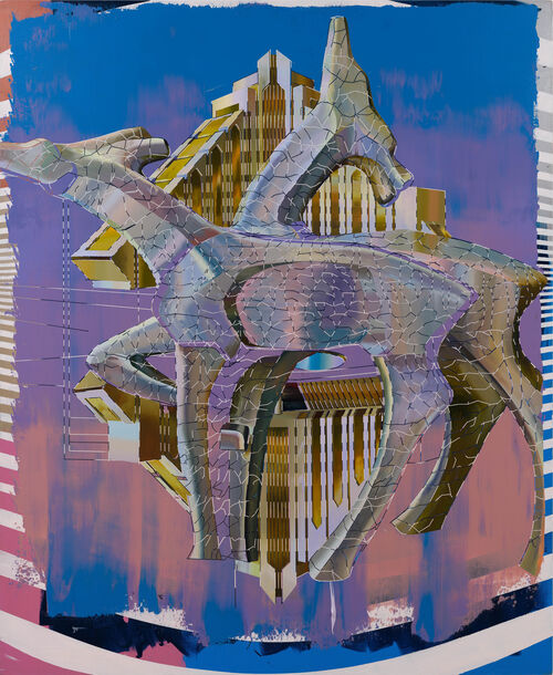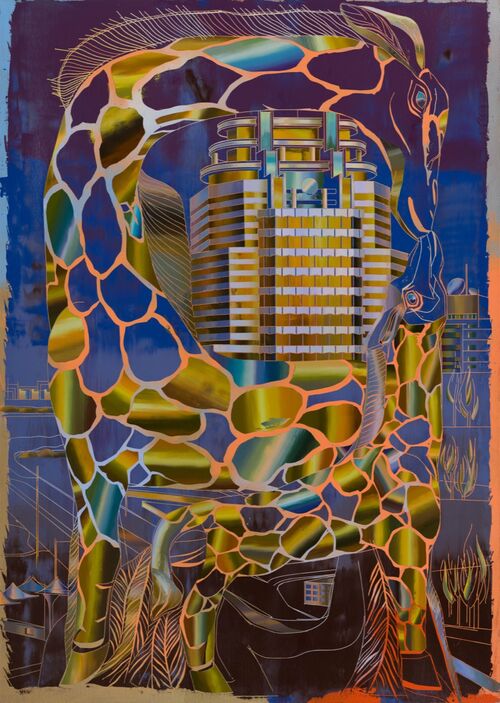 Formed from layer upon layer of paint with cuts through them, Jie’s paintings in “Thermal Landscapes” amalgamate renderings of modernist towers and oversized ceramic Chinese animal ornaments, drawn from the artist’s own collection. Such ornaments, which date from the 1970s and ’80s, and, for Jie, symbolize the growing Chinese economy of the time, often depict animals meeting their mouths as if kissing, creating a circular motif which repeats across the exhibited series. The artist said that this represents “continuity, legacy, and what different generations leave behind for the next, the cycle of life.” Formally, the circle formed of two animals also offers a useful framing device for Jie’s painted architecture, a selection of unremarkable modernist towers from China, the Middle East, and Africa.