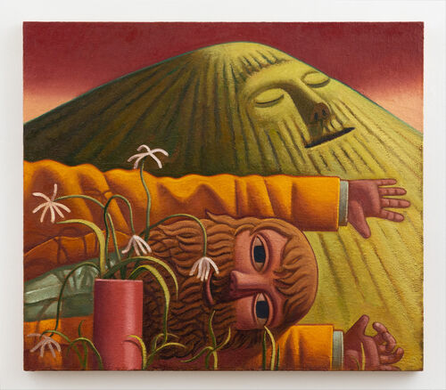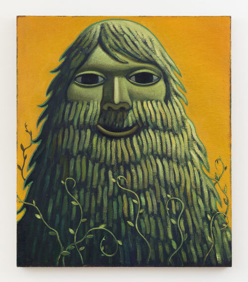 Meanwhile, that face in the mountaintop—a sage-like figure—recurs throughout the show. Drawing on lumberjack mythology as well as West Coast tales of hippies and gurus, Meade’s dreamy figures are braving nature to seek insight from the mystical man seen in the mountain (and on a sheet pinned to a tree, and in a cave). But the futility of their task nags: In two works where Meade depicts this guru alone, it becomes evident that he is hollow, made of stone—a yawning, empty vessel on which to place hopes of enlightenment.