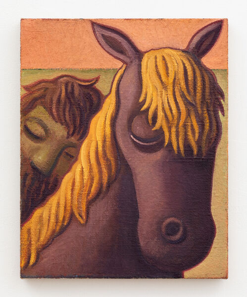 Horses abound in this body of work, displaying physical intimacy with their riders and referencing westward expansion, a project of American masculinity. But of the many figures (both equine and human) depicted in the show’s 13 works, only two gaze back at viewers: the subjects of Heap, a close-cropped portrait of an aquatic-hued man; and of Homestead, (both 2023), in which another man lays on his side while an anthropomorphized mountain smiles serenely in the distance. Downturned eyes on the rest of Meade’s subjects suggest shyness, or contemplation, or hiding their true emotions from the world.