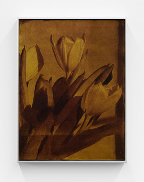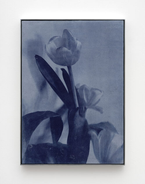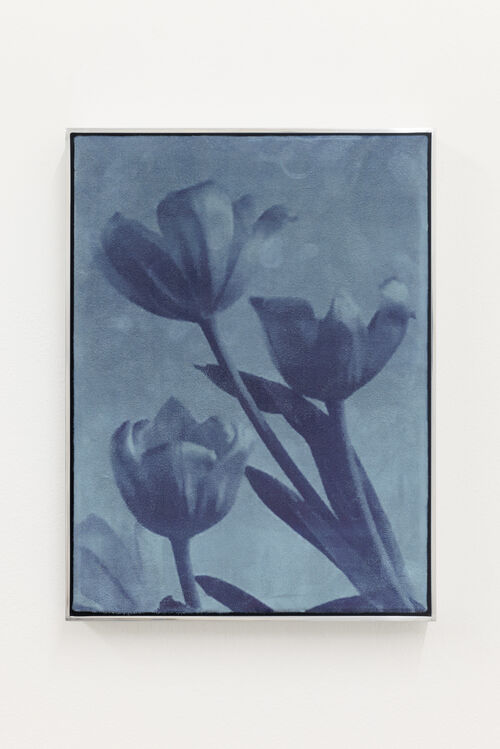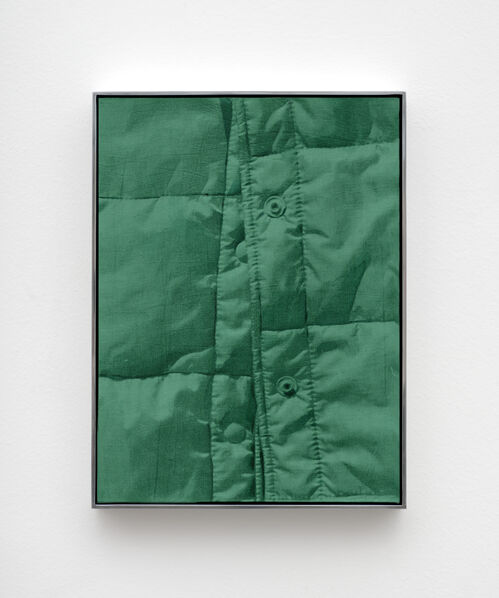 Poppy Jones (B. 1985, London) has quickly gained acclaim for her highly tactile artworks that waver between painting, printmaking, and photography. The works are all intimate still lifes of everyday objects like a shadowed bouquet of flowers in deep burgundy, an indigo puffer coat, a standalone lemon, and a wrinkled silk shirt. Some of the objects are shown closely cropped, abstracting the familiar forms. Others are shown in a more traditional still-life format, placed on a flat surface, similar to how one might encounter objects to draw or paint in a studio art course.