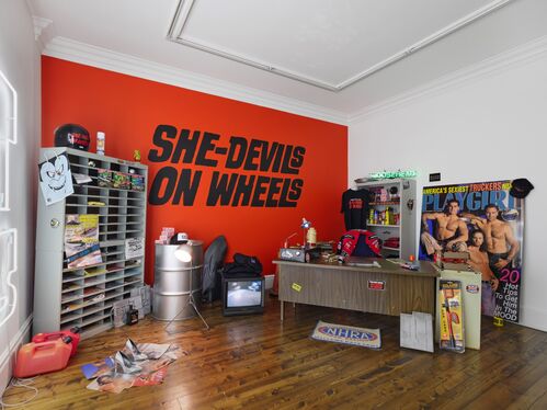 In another room, large-scale sculptures of space rockets are covered in synthetic white fur. An installation recreates the headquarters of the She-Devils on Wheels—a motorcycle gang Fleury created after she was rejected from a car club. Throughout the exhibition, designer high heels appear as sculptures displayed on plinths as objects of consumption. Desire is a throughline is this deliriously feminine show.
