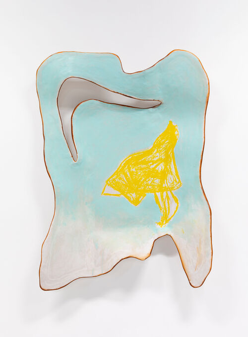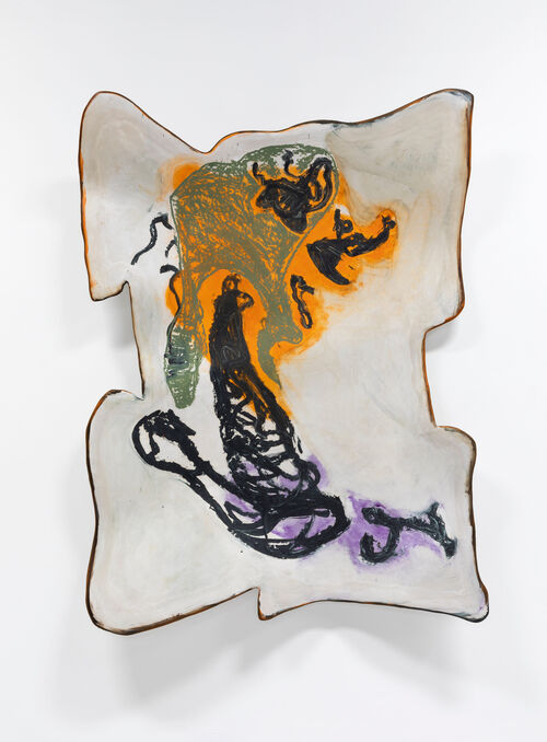 For this exhibition, he bent, cut, tore, and glued materials like fiberglass, cardboard, and resin. The final forms curl at the edges, as though straining against an invisible force. They are adorned with energetic, gestural marks evocative of some Abstract Expressionist paintings. Titles like Carpool, Yurei (named after a Japanese folk ghost), and Belfry (an element of a clocktower) evoke a variety of realms and inspirations, from the communal to the mythological.