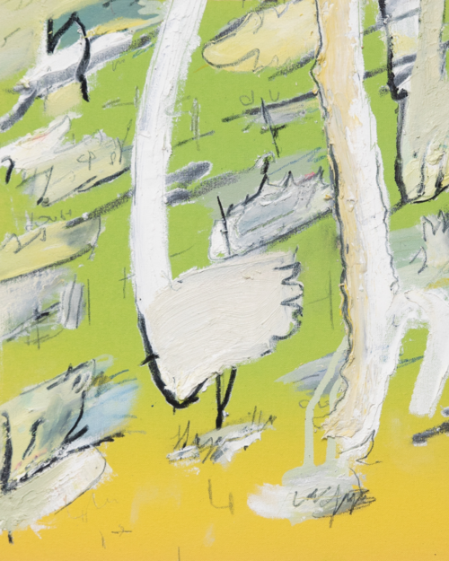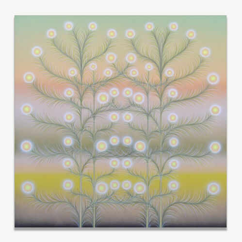 These works question the authenticity of nature, looking beyond the material. Instead, as evidenced in Tend (2023), she traces the sensorial limbs of a tree, painting small balls of light at the end of each branch. Her work experiments with modes of communication, testing how we interact with and perceive nature.