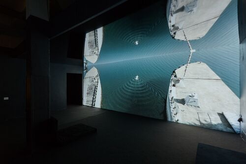 In the Nordic House exhibition, which is dedicated to the Water chapter, Emilija Škarnulytė has created an immersive, cavern-like space with iridescent sculptures reminiscent of lava lamps for her video Sirenomelia (2017). The work’s title refers to a rare congenital disorder also known as “mermaid syndrome,” in which babies are born with their legs fused together. The video’s protagonist is a mermaid, played by the artist, who dives and weaves through the ruins of a former NATO submarine base in the north of Norway that was active during the Cold War.
