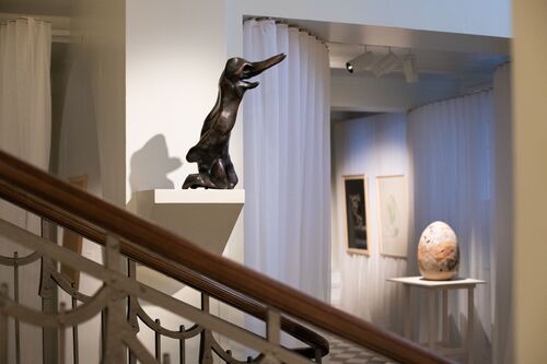 The sculptural series emerged from Nordal’s deep-seated fascination with birds, which figure prominently in Icelandic folklore and in the country’s natural environment. In many cultures, they are also symbols of the soul’s departure from the body upon death. Nordal’s Blirds embody this idea of transition and struggle—between the earthly and spiritual, and between matter and form (since the sculptures originate in clay on a small scale before being enlarged with a 3D printer). With their frail legs and guileless, inquisitive faces, these creatures that dwell between realms exude vulnerability and demand our protection.