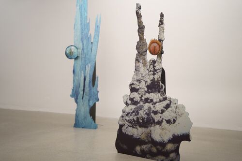 The Water section of the exhibition also features two fantastical sculptures by Katja Novitskova resembling towering fingers of rock, each jarringly affixed with what looks like a large reptilian eye. Titled Hydrothermal Potential (Lost City) and Hydrothermal Potential (Loki’s Castle) (both 2015), the works were created from found digital photographs taken by robotic autonomous underwater vehicles and printed on aluminum cutouts (the eyes being also sourced from the internet).