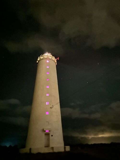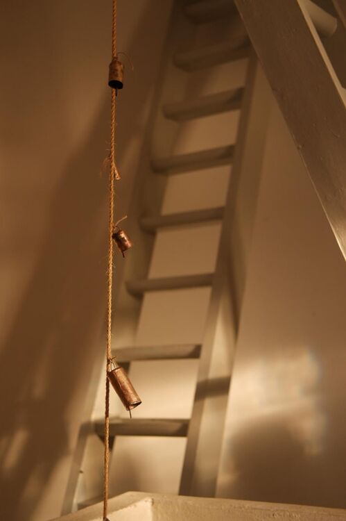 Precious Okoyomon and Dozie Kanu have created an atmospheric installation, Fragmented sky - wind - fly giving presence to wind (2023), at the Grótta Island Lighthouse at the northwestern-most point of Reykjavik. For this work, the artists have strung up 600 small bells on long ropes between poles along the shore, around the perimeter of the lighthouse and up through the interior, which chime in the wind, giving the visitor the sense of being on a pilgrimage. This impression is heightened by the limited accessibility: Surrounded by black sandy beaches, within a nature reserve, visits must be carefully timed as the lighthouse sits on a spit of land that becomes submerged by the sea at high tide.