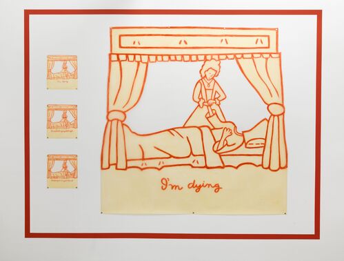 Referring to herself as an “image scavenger,” Applebroog transformed scenes from television and fashion magazines with a critical feminist lens. Her approach to art challenged the status quo but also highlighted the underlying structures that perpetuate gender biases. As in her work Galileo Chronology: I’m dying (1975), her pieces often featured headless or physically manipulated people to evoke distressing interactions.