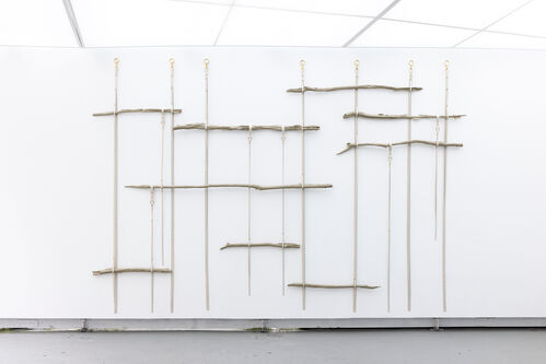 “Decorate,” Gysin’s second solo show with Galerie Christian Lethert, presents a series of sculptures emerging from this material exploration. The wall-mounted Wall Fence I (2021) is emblematic of his approach, towing the line between a representational sculpture of a wooden palisade and a purely decorative craft. Elsewhere, the artist’s exploration of color pulls in the viewer, especially across his “Satinbild” series of satin paintings on wood. These works, awash with blue, mauve, and green, use color to craft illusory patterns: yet another experiment in perception.
