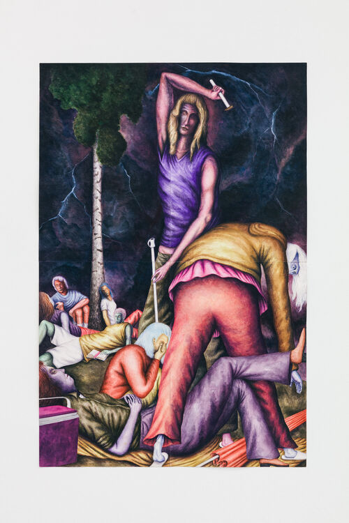 In “Parks and Recreation” at DREI, artists’ work on view examines the idea of urban parks, exploring their role as areas for leisure, romance, sexuality, and social contrasts. For instance, Matthias Noggler’s Tempest (2020), created with gouache and pencil on paper, depicts a group of people relaxing in the park, set against an impending thunderstorm. In the center of this scene, a figure (perhaps suggestive of the ancient Greek god Hephaestus) hammers in a stake that resembles an umbrella. Meanwhile, Gaylen Gerber’s sculptures of beer cans and paper bags seem to directly reflect the detritus of leisure in public spaces. The exhibition also features work from Anna Sophie Berger, Anita Leisz, Beaux Mendes, and Julian Tromp.
