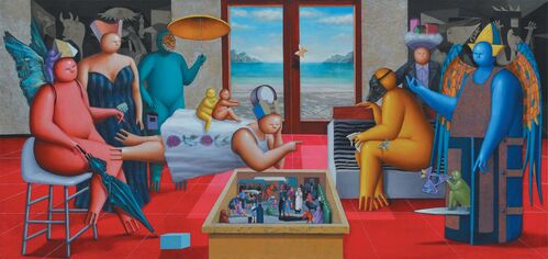 Elsewhere, in Esperanza (2023), the artist portrays several of her characteristically rotund figures with animal masks, wings, and other strange costumes, merging realistic and fantastical elements. The influence of Surrealists like René Magritte is clear, with some figures floating, and another with its head in the clouds, topped by tiny houses.