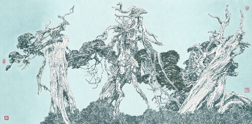 In his new show at Illuminati Fine Art, “Sanctuary- Demeanour and Attitude/ Part II,” Taiwanese artist Tsung Jen Lee continues his painterly exploration of the alpine juniper tree. Born in Taiwan in 1966, the artist draws inspiration for this series from pastels made during the Qing dynasty and CongXian Wang’s photographs of juniper trees. In addition, a personal family struggle with cancer profoundly influenced his perspective, infusing his paintings of trees with a deeper emotional connection: Humans, too, have to fight against the odds. His continuous study of the spirit of these hardy trees, which grow in the harsh climate of the highest mountain regions of Taiwan, creates a thematic link between nature’s resilience and the artist’s own experience with personal tragedy.