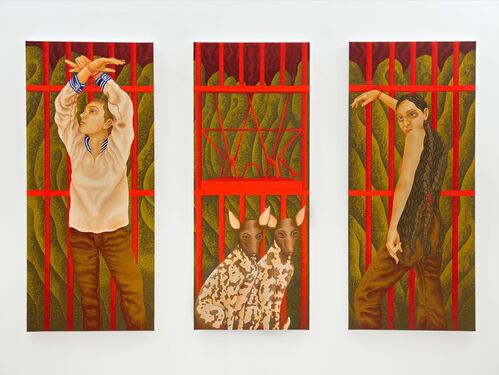 Her second solo exhibition at 1969 Gallery, “Bodas de Sangre,” comprises eight paintings, six works on paper, and one sculpture. At the heart of the show is the triptych Hortus conclusu, Léa y María (2023), featuring two Mexican hairless dogs flanked by portraits of Fragoso Jara and her partner—in Aztec mythology, these dogs usher the dead into the afterlife. The triptych, featuring a red fence in the backdrop of each panel, evokes spiritual themes of death and immortality. These figures, with dogs as their ushers, exist in between the physical world as they evoke the spirituality of the afterlife.