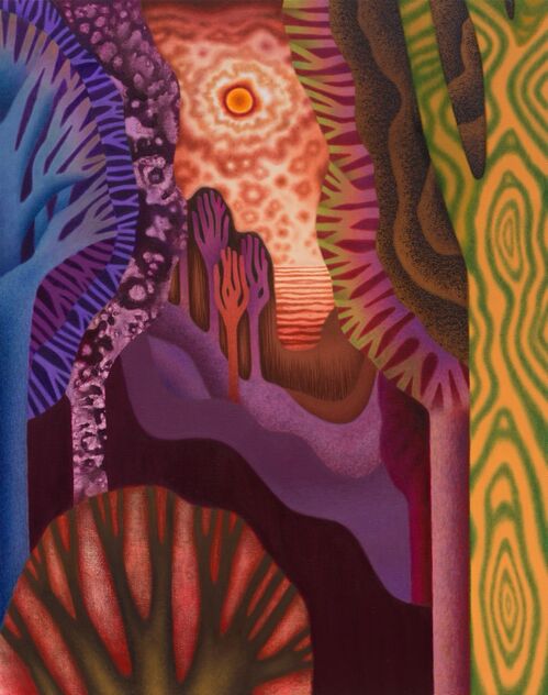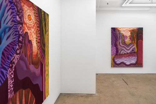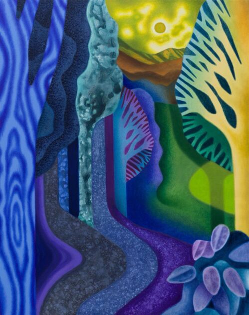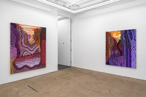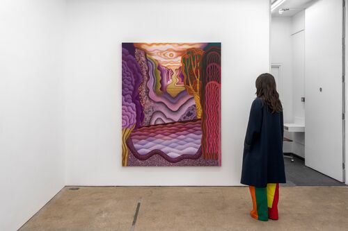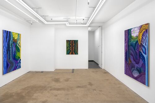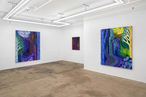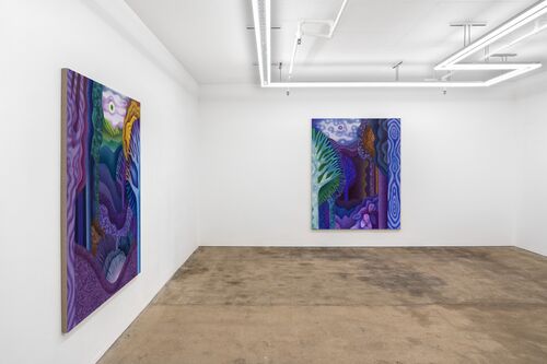 Building on her recent solo presentations with Galerie Marguo in Paris and HESSE FLATOW in New York, the pieces on show at Public Gallery through December 15th are defined by hyperpigmented color palettes, multidimensional depth, and detailed patterning. In them, we see Baldwin delicately balancing seemingly opposing ideas to create worlds that are intrinsically beguiling but, crucially, still believable. In every piece, she thoughtfully incorporates elements of the real and the familiar, along with the imaginary and the unknown, to defy expectations while still portraying the beauty of the natural world.