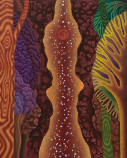 “I like the idea of things being recognizable but at the same time different in my work,” she said. “There are very familiar elements that one is used to seeing in nature, but they are always a bit skewed, a bit different, or a bit exaggerated.” In Burning the Breeze (2023), for example, swirling pea-green patterns decorate a luminous yellow tree in an exaggeration of tree bark’s naturally occurring spiral grain. The mauve tree that lies behind it, meanwhile, sees Baldwin reimagining the natural fractals of tree branch distribution into an elegant haze of ombré paint.