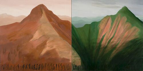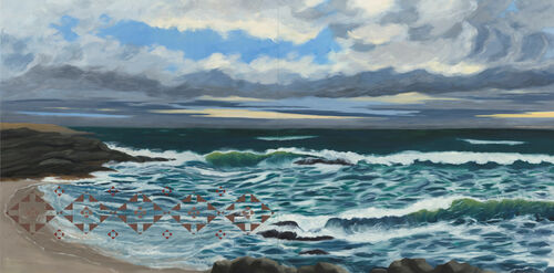Once she’s selected a pattern, she creates a stencil, which she uses to apply the pattern halfway along the bottom of her signature diptychs. The Indigenous patterns occasionally echo elements of the landscape, such as a soft mauve that mimics the sand in Aquidneck, After the Storm (2022) or a vertical shape that matches the upward thrust of rock in Saint Mary’s Mountain (2011). The patterns have a hypnotic, almost incantatory effect. They reverberate through the landscape, activating and animating it.