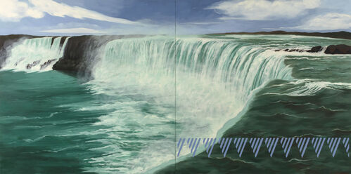 Following that tour, WalkingStick went to Niagara Falls. The result of this visit—Niagara (2022), which was later acquired by the museum—hangs in the final room of the exhibition. In it, WalkingStick emphasizes the awesome scale of the Falls. Her goal was much the same as that of Louisa David Minot, one of the few women artists within the Hudson River School. Minot also sought to capture the Falls’ vast majesty in her paintings, and her efforts hang nearby in the exhibition.