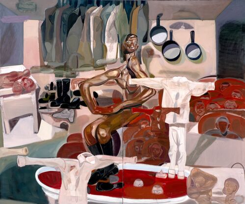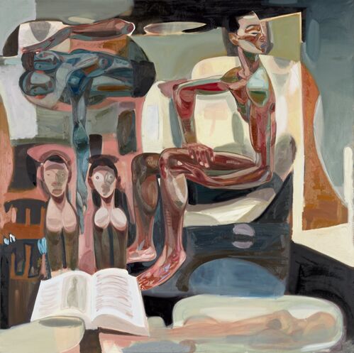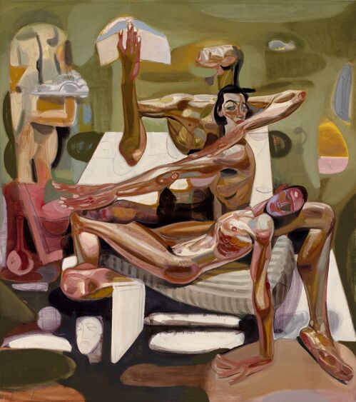 Many of his paintings challenge the act of looking and being looked at. His figures often stare directly at the viewer: They are naked and potentially exposed, but they do not seem afraid of the viewer’s gaze. “I want to make it as though you are looking into someone’s private space,” he said. “They are not hiding anything, and they are OK with that. They are staring at you; you are staring at them. Sometimes there is an exchange where the viewer is scrutinized and looked at. Psychologically, if someone stares at you for too long, it makes you uncomfortable. But I like that effect in the work. In Germany, at one point, I felt I was being looked at all the time.”