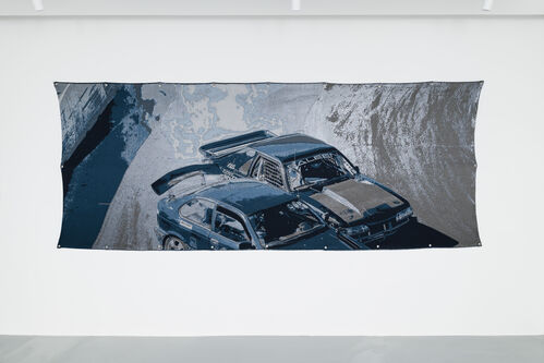 For over a decade, Constanza Camilla Kramer Garfias has mastered jacquard weaving—a technique dating back to the 15th century. Educated in textile design at the University of Arts and Design Burg Giebichenstein in Saale, Germany, Kramer Garfias melds concepts of industrial production with traditional handcraft in her “Autodrift” series. These textile works, focused on car races and drift driving, present subjects—mostly race cars—in motion, reflecting the fleeting beauty and vitality of a high-speed moment.
