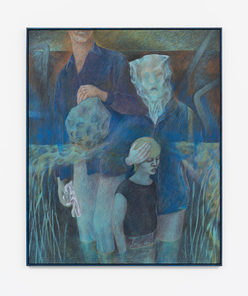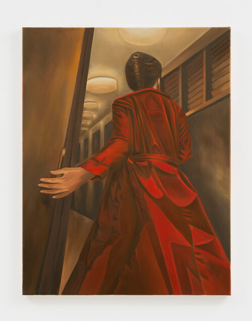 Throughout “About Painting III,” the artists consistently captivate us with their exploration of the uncanny. This is even evident in Rouphail’s still life Hothouse Flowers (2023), where he manipulates light, shadow, and reflection to add a layer of depth and intrigue to the familiar image of flowers on a table.