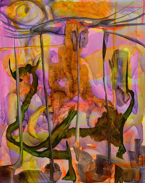 For his current exhibition, “Sun Script,” Gleiwitz began by immersing himself in his primary subject matter: the sun. During sun-drenched countryside walks, he created watercolor sketches of the scenes he encountered. Back in his studio, he reimagined these sketches as large-scale oil paintings. Here, he transformed his initial impressions into complex compositions of tangled curves and vivid colors, each piece radiating with an intensity akin to the sun’s glare.