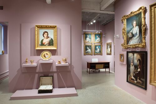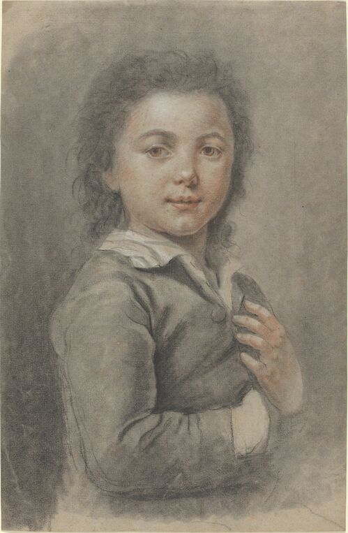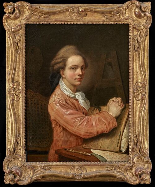 One such example included in the exhibition is Portrait of the Artist Carle Vernet (1758–1836) (ca. 1770s), an image of Carle Vernet that shows him in a dark background with tools of his craft visible, including an easel, sketches, and a paintbrush. The vibrant hues of his clothes demonstrate Lusurier’s eye for color. The sitter looks directly at the viewer, a highly uncommon position likely influenced by Lusurier’s mentor, Jean-Germain Drouais. “She was smart to know that making eye contact with the viewer would cause quite a stir,” said Brilliant.