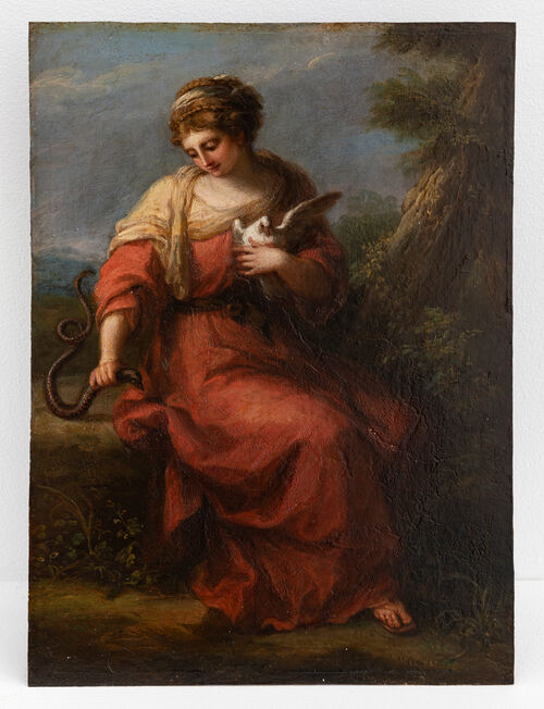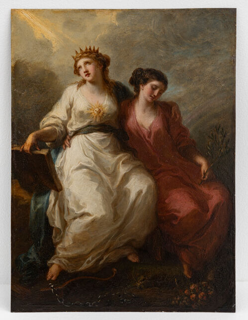 Angelica Kauffmann was widely celebrated for her skillfully made, multifigured history paintings and portraits that would have been coveted among the upper class, including the two oil on metal works in the exhibition, Allegory of Prudence and Allegories of Mercy and Truth (both before 1780). With artistic training from her father, Kauffmann made a name for herself and, along with Mary Moser, was one of only two founding female members of the Royal Academy in London. Even so, she was still unable to study the nude male figure; in fact, the Royal Academy didn’t allow it until the 1890s, over 80 years after Kauffmann’s death.