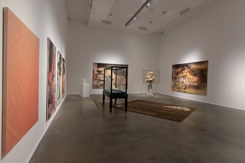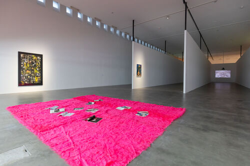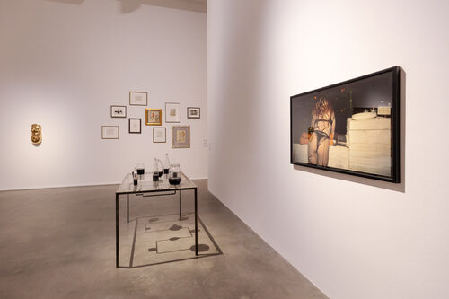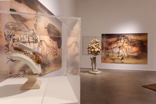 “Visual Persuasion,” which is on view through February 25, 2024, sprawls across the Fondazione’s entire exhibition space—a rarity for the museum, as the show’s curatorial coordinator Irene Calderoni explained in a walkthrough. A 1970s visual aesthetic recurs in many of the works: Neon lights, allusions to soft-porn cinema, and go-go boots, for example, all feature. Though Olowska was only born in 1976, she cited the decade as the source of her “visual education,” she explained in an interview with Artsy. “I just love it, because it had a spirit of freedom,” she said.