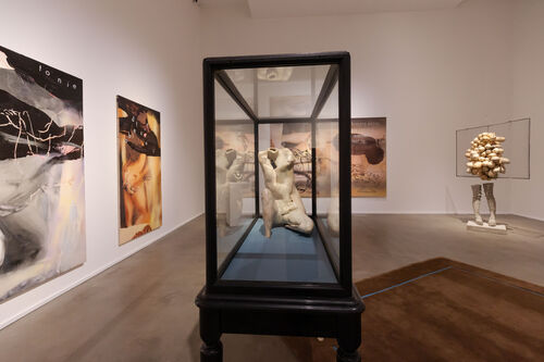 This embrace of contradictions is evidenced through the pairing of Olowska’s smoothly contoured feminine sexual appeal with the gross, monstrous aspects of the flesh explored by other artists in the exhibition. In the same room as the series of Viva-inspired paintings is Berlinde de Bruyckere’s sculpture La Femme Sans Tête (2004), a wax sculpture resembling a misshapen human body with layers of skin and flesh drooping into one another. Also sharing the space is Nice Tits, a 2011 sculpture by Sarah Lucas in which breast-like protrusions made of stuffed nylon tights extrude through a metal grid, creating a striking, globular mass.