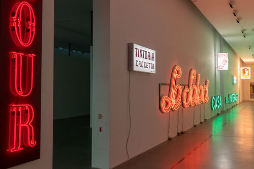 Neon is another theme in the show, which dedicates an entire corridor to signage. The medium has a particular resonance for the artist, who grew up with socialist versions of brightly lit signs in Poland, then part of the Eastern Bloc. “They were made not to advertise, but to state ideas,” she said, recalling charming examples of signs from her childhood with messages like “let’s meet in the cinema.” Other enticing neon signs, she said, spread public service announcements about the importance of handwashing or dental hygiene, a stark contrast to the commercial usages that neon has in the West. For Olowska, neon and women’s bodies are used in similar ways in advertising—as hollow, commercialized emblems of desire.