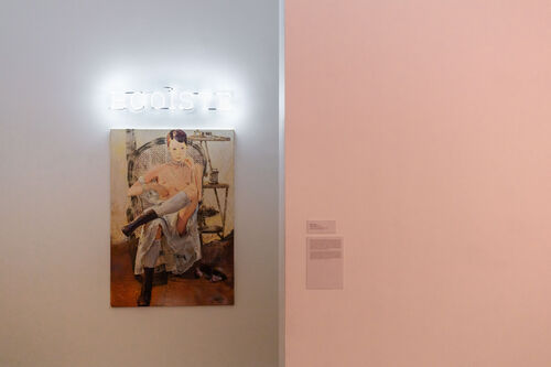 To this end, the artist makes repeated claims for female ownership of desire throughout the show, drawing inspiration from 1970s porno chic, particularly as typified by the French movie Emmanuelle (1974). At the opening of the show, Olowska’s painting Loveress (2020) recasts the infamously explicit film’s poster in paint. Though the movie’s skirting of disturbing themes isn’t without controversy, Olowska sees a sense of “emancipation” in its portrayal of the eponymous character making a journey of pleasure and sexual exploration through an expat underworld in Bangkok. This attention-grabbing painting by Olowska is paired with a work by Sylvie Fleury: Egoiste (1996), which renders the work’s title—translating to “self-centered”—in white neon. For Olowska, it seems, the curatorial implication is clear: If desire is selfish, so be it.