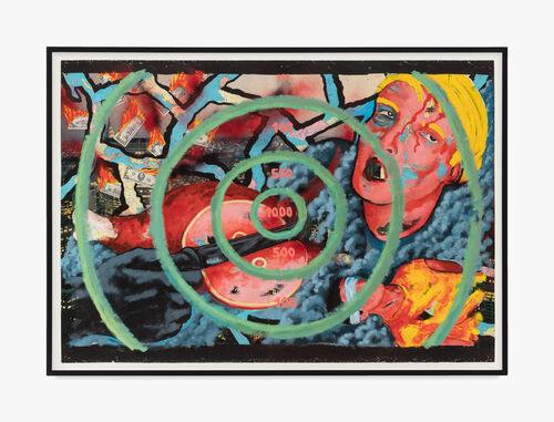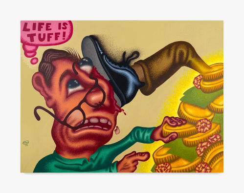 Peter Saul’s Life Is Tuff (2023) is unnerving. The painting, depicting a man’s head being crushed by an imposing black boot as he reaches for gold coins, was Saul’s response to the financial squeeze that most New Yorkers have experienced. Crushed by a symbol of the capitalist system, Saul’s figure is bludgeoned by the faceless powers that be, his nose broken and eyes gouged. The work is hard to look at, but then again, unsettling times often create unsettling art, forcing us to confront the harsh realities of the world rather than hiding behind the aesthetic comfort zone of beauty.
