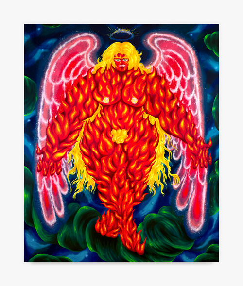 Other works in the show challenge conventional visual aesthetics, such as Ana Benaroya’s Your Good Girl’s Gonna Go Bad (2023), a massive painting that depicts a muscular female angel whose body is comprised of shocking red flames. Though arguably one of the more appealing paintings in the show, Storr finds a throughline across artists and chronology, drawing together different modes of provocation and anxiety as universal experiences to those who can see. “Stylistic affiliation has been of no concern to me whatsoever,” Storr wrote in his curator statement. “Funk, Imagism, Underground Comix, you name it, are all just temporary labels for the expressive imperatives characteristic of ‘Retinal Hysteria.’”