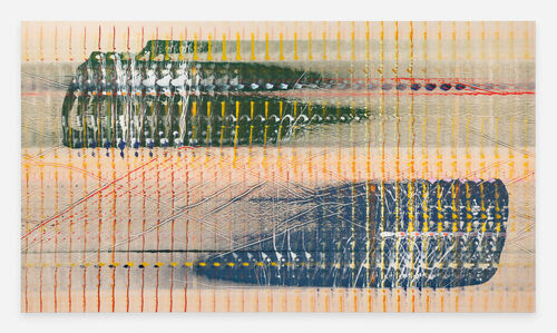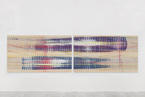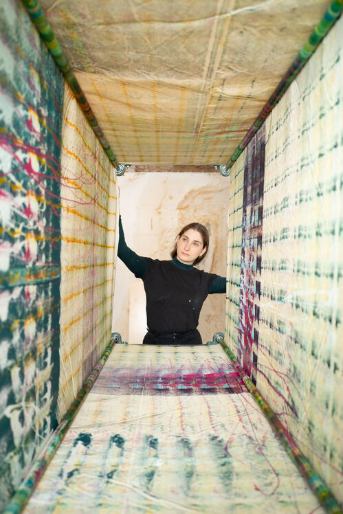 Kraus’s method is highly unusual: To make her paintings, she stands inside a cage-like frame with a raw canvas looped around it. She then uses the struts of the metal cube as rollers, adding dabs of paint to the material then manually pulling it around the structure. In this way, she creates her recognizable linear marks. Having devised this technique to reconfigure the spatial constraints of her assigned studio at the Royal College of Art, she has come to rely on it as a way of expressing the cyclical rhythms of the natural world.