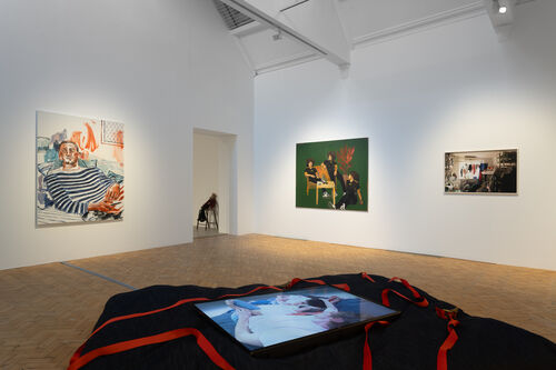 Harriet Gillett’s three miniature paintings are among the most enticing works on show. Intimate in scale and subject matter, they feature hazy renderings of the artist’s friends as if seen through a rose-tinted lens. Blurring the boundaries between abstraction and figuration, Gillett’s barely decipherable scenes demand a focused gaze.