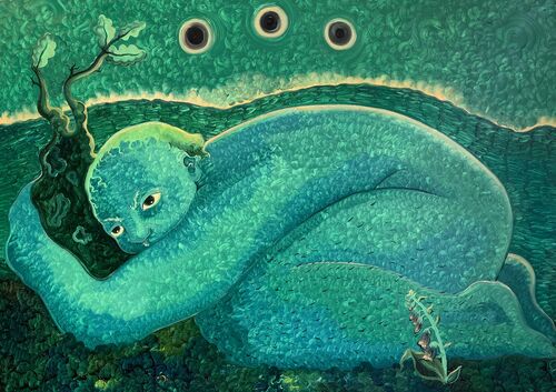 In her practice, the British landscape is reimagined through renderings of fictional events and fantastic terrains, often populated by bulbous, untamed creatures. By giving form to a world where benevolent beasts convene merrily with their surroundings, Wilson aims to ignite a renewed enchantment with the natural world.