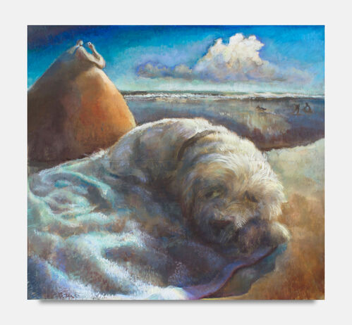 Inspired by the writings of Donna Haraway, Ranny MacDonald explores the relationships between people and dogs as a tool to destabilize anthropocentric worldviews within his work. His canvases, which often have warped perspectives, challenge the viewer to inhabit the canine body and see their environment anew. Like Haraway, MacDonald is deeply concerned by the climate crisis, inviting humanity to build kinship with other life forms through his joyful and humorous pieces. His ecological interest extends to his materials: He uses handmade pigments formed from discarded metal oxides, crushed bricks, and soil.