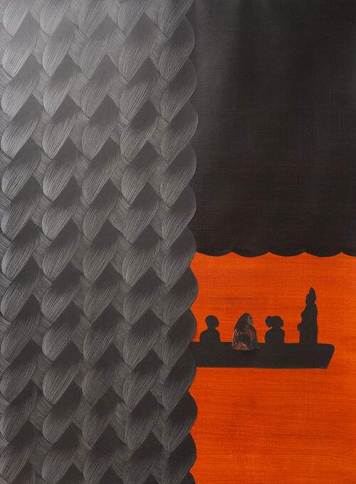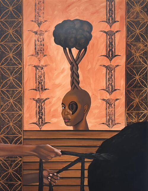 Her piece on show at Camden Art Centre, Labour of Self Love (2023), is tender yet disconcerting. While a figure carefully plaits another’s afro hair in the foreground, the composition is unsettled by a one-eyed woman who stares boldly out of the frame. Inherently mysterious, this work implies that we are only seeing a fragment of the overall story.