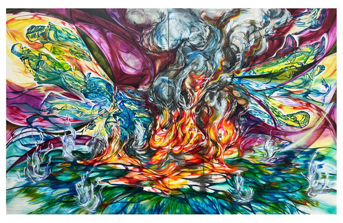 Ji Won Cha envisions her paintings as a means to delve into the “anxious sublime,” a concept she developed to articulate the complex emotional landscape induced by 21st-century life. Her work—often vivid, bright renderings of animals or plant life—transforms natural landscapes into surreal worlds, where images blend into one another.