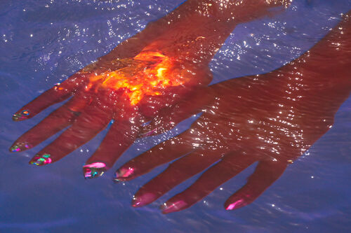 Water serves as a unifying motif in Space (2023) and Portal (2022), which feature hands and a floating figure under luminescent rippling currents. Each work captures the connection between humans and the natural world, unveiling a search for meaning and belonging.