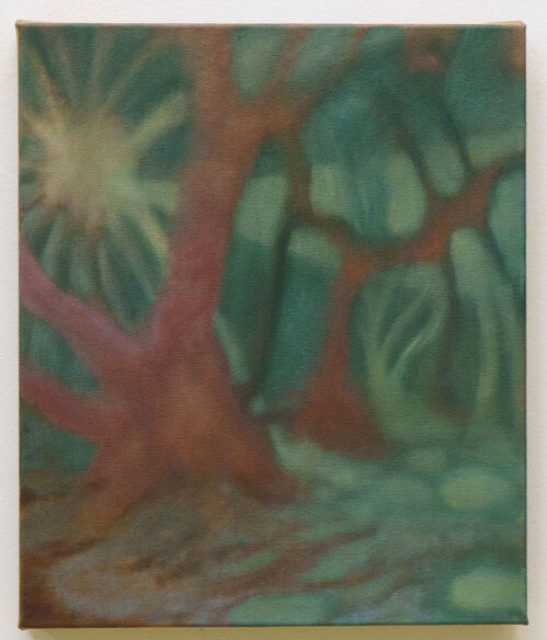 In Schneiderman’s Foundations presentation with New Mexico–based gallery The Valley, where the artist presented his first solo exhibition, his paintings are both an intuitive expression of his identity and a subtle commentary on our relationship with the environment. Well-Spring (2022), for instance, shows a hazy, dreamlike scene of trees under a muted sun. These obscured renderings evoke memory-like explorations where discovery is of the utmost importance. Other paintings, such as The Observer (2022), depict androgynous figures amid an abstract backdrop, seemingly stuck in static contemplation.