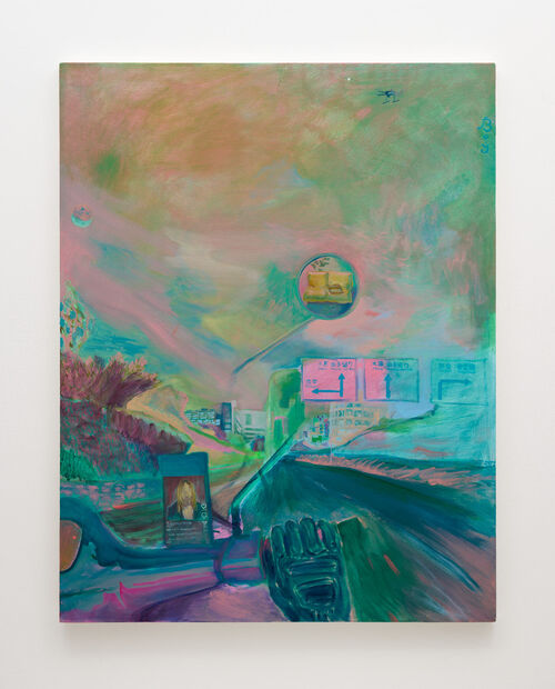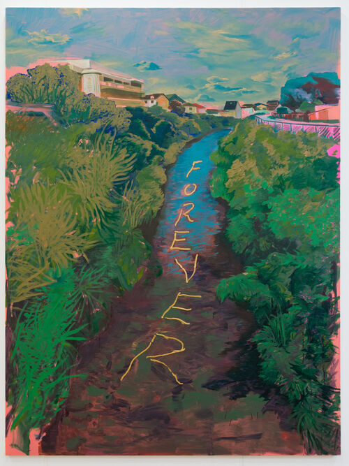 In Yang’s Foundations presentation with Yutaka Kikutake Gallery, the Tokyo gallery with whom he has mounted numerous exhibitions, a quality of dreamy wistfulness is often disrupted by troublesome details. The aurora-like skies of a passenger (2023) are punctured by a hovering drone, while the painting’s subject—the rider of a moped, seen from a first-person perspective—zooms through a scenic cityscape, but is distracted by a phone mounted to his handlebars. In another pair of vibrant landscapes, River (forever) and River (and ever) (both 2019), the titular phrases appear on the surface of a river, soon to be washed away—a reminder of the transient nature of promises.