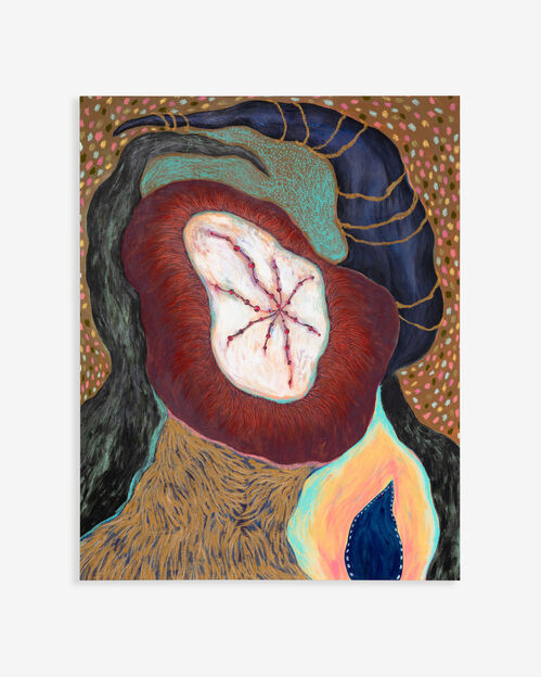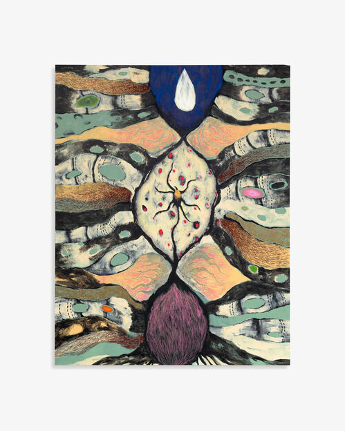 Mariana Rocha’s bright, organic paintings in acrylic and oil pastels delve into her intimate understanding of her own self: As the artist told i-D, her works “start from the idea that there is a sea inside my body.” In a palette of contrasting shades, she evokes a range of natural subjects, from microbial life to underwater creatures, as tentacles creep across her canvases of cell-like forms. Weaving spiky shapes together with detailed, careful brushstrokes, her intuition-led paintings sometimes start from randomly created stains.