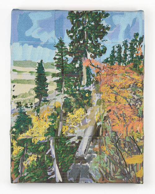 Diving head first into the digital world, American artist Frank Lepkowski explores the role of technology in modern life through an expansive oeuvre that includes software, installation, and painting. United by the centrality of human thought, his works often draw on digital phenomena and algorithms, which are embroidered, woven, and melded into dense, vigorous compositions.