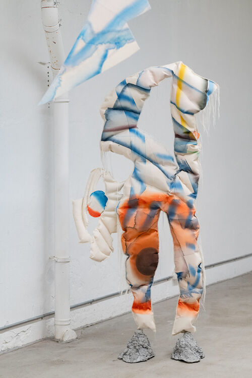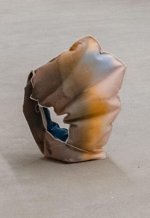 In addition to her wall-based works, Eriksen ingeniously transforms painted canvases into freestanding sculptural pieces that exude a sense of weightlessness. Included in Foundations, the sculpture Warm Stone (2023) resembles a dollop of whipped cream gracefully resting on the floor. Its haphazard yet intentional shape conceals a structured interior scaffolding, crafted from concrete and steel.